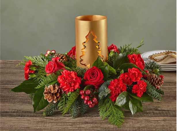 Add blustery cheer to any holiday table with this coniferous centerpiece studded with cardinal?red flowers and berries gathered around a glowing candlelit tree lantern.