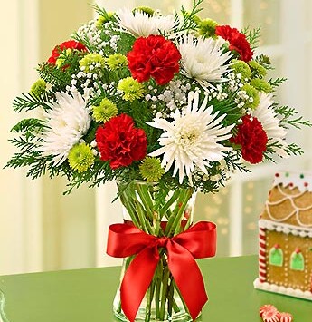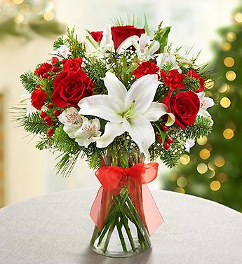Inspired by European style, our expert florists gather festive red roses, white lilies, alstroemeria, mini carnations and fragrant assorted greens in a stylish glass gathering vase, accented by a red ribbon.