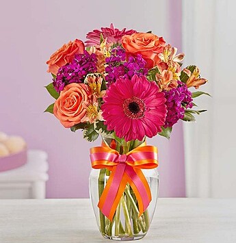 A combination of blushing hues and sunlit warmth, this spring bouquet blossoms with love and gratitude to make the season brighter with each hand-picked flower! Hot pink roses and brilliant yellow Asiatic Lilies will capture your recipient’s every attention, surrounded by pink and yellow Peruvian Lilies, fuchsia snapdragons, bupleurum and lush greens. Presented in a keepsake berry pink glass vase to give this design a head-to-toe finishing touch, this gorgeous flower arrangement is set to create the perfect Mother’s Day. Limited Availability Due to limited varieties and quantities available at this time, this arrangement may be designed with thoughtful substitutions without prior notification.