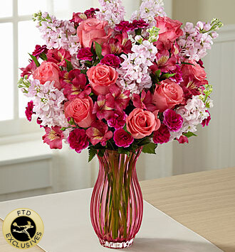 Loving Thoughts Bouquet is an enchanting arrangement bursting with fantastic color and sophistication. Pink roses, pink Oriental Lilies and purple stock are accented with lush greens and presented in a designer clear glass vase to bring your every wish of hopeful happiness to your special recipient.