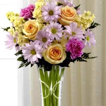 Your mom would be thrilled to get this Pretty in Pink Bouquet. Pink roses, pink alstromeria, white alstromeria, white carnations arranged in a beautiful pink vase.Limited Availability Due to limited varieties and quantities available at this time, this arrangement may be designed with thoughtful substitutions without prior notification