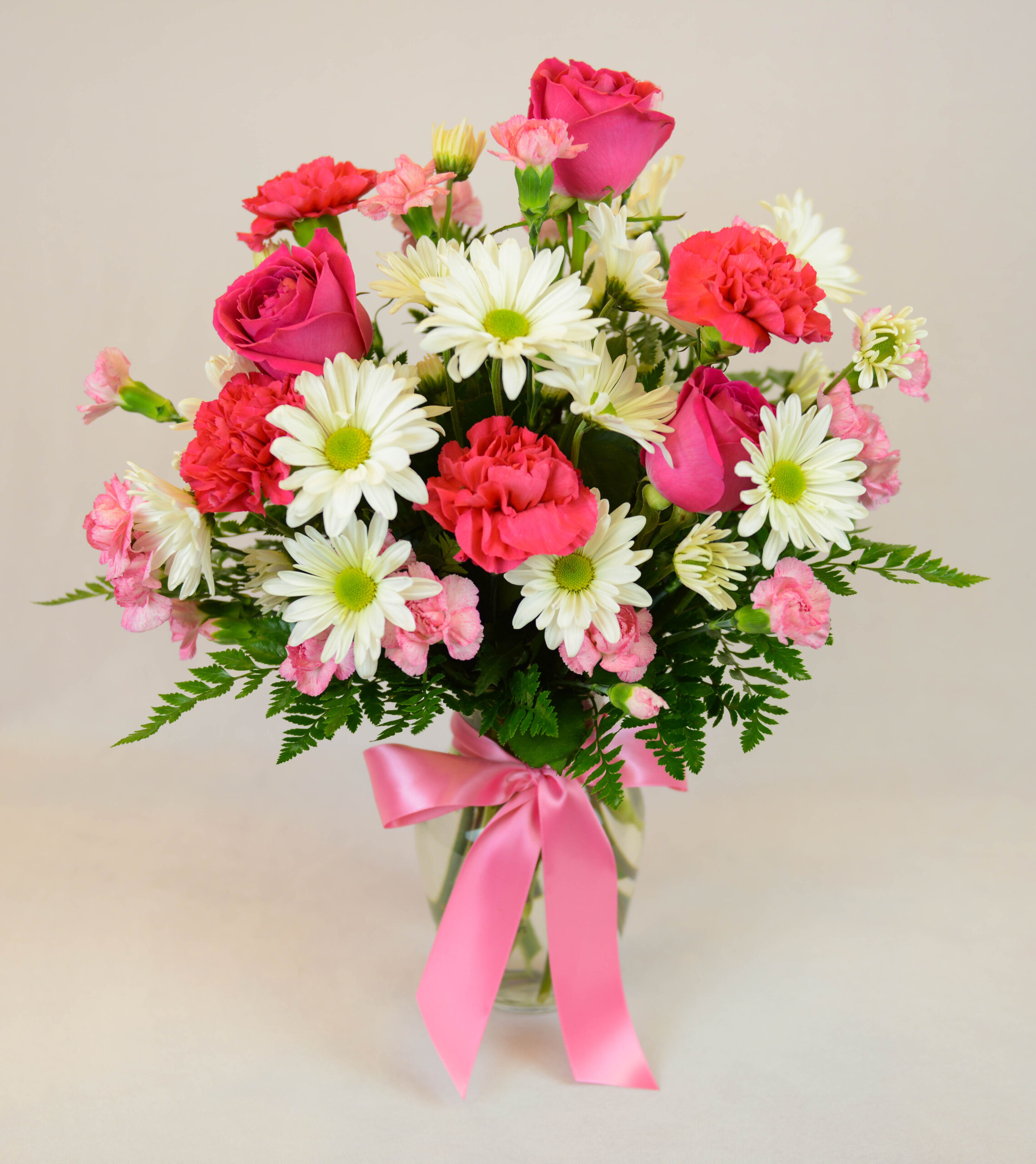 Sending a Sweet Surprises Bouquet by FTD is an absolutely charming way to send your warmest sentiments. Pink mini carnations, hot pink rose stems, white traditional daisies and lush greens are sweetly situated in a classic clear vase accented with a perfectly pink designer ribbon to create a bouquet that will delight your special recipient at every turn